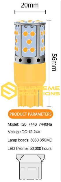 The SUPREME SOLUTIONS 7440-3030-35SMD LED bulb delivers bright yellow light for signal applications. Built with premium Samsung 3030 SMD LEDs, it provides enhanced visibility and instant illumination response.