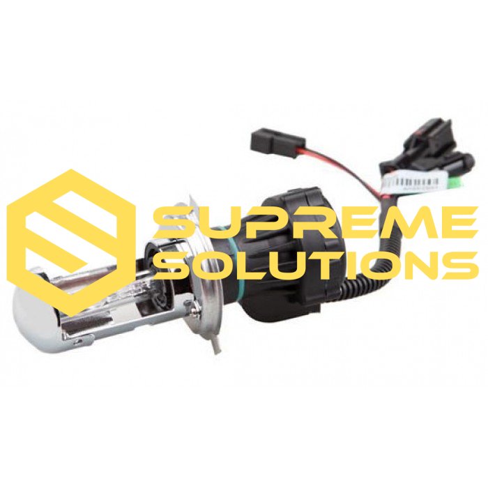 A specially designed gas discharge lamp with a movable bulb and a metal curtain on top, providing low/high beam and installed in single optics of cars.